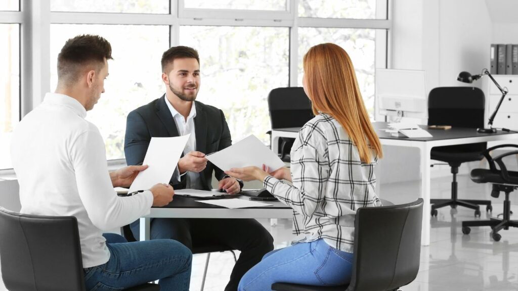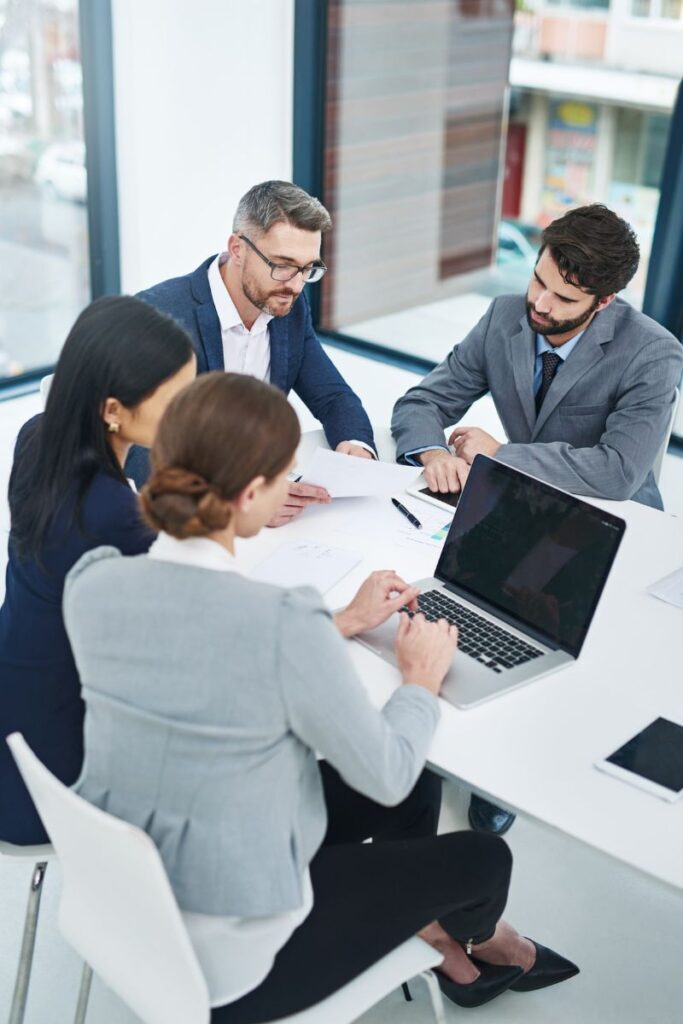 Professionals in a business meeting reviewing documents at a glass table, representing collaboration in an executive search firm.